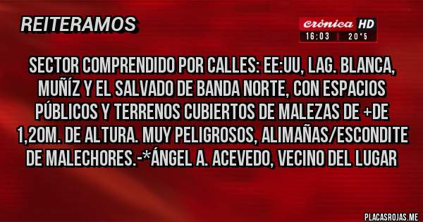 Placas Rojas - Sector comprendido por calles: EE:UU, Lag. Blanca, Muñíz y El Salvado de Banda Norte, con Espacios Públicos y Terrenos cubiertos de Malezas de +de 1,20m. de altura. Muy Peligrosos, alimañas/Escondite de Malechores.-*Ángel A. Acevedo, Vecino del Lugar