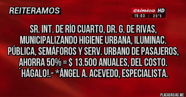 Placas Rojas - Sr. Int. de Río Cuarto, Dr. G. De Rivas, Municipalizando Higiene Urbana, Iluminac. Pública, Semáforos y Serv. Urbano de Pasajeros, AHORRA 50% = $ 13.500 Anuales, DEL COSTO. ´HÁGALO!.- *Ángel A. Acevedo, Especialista.